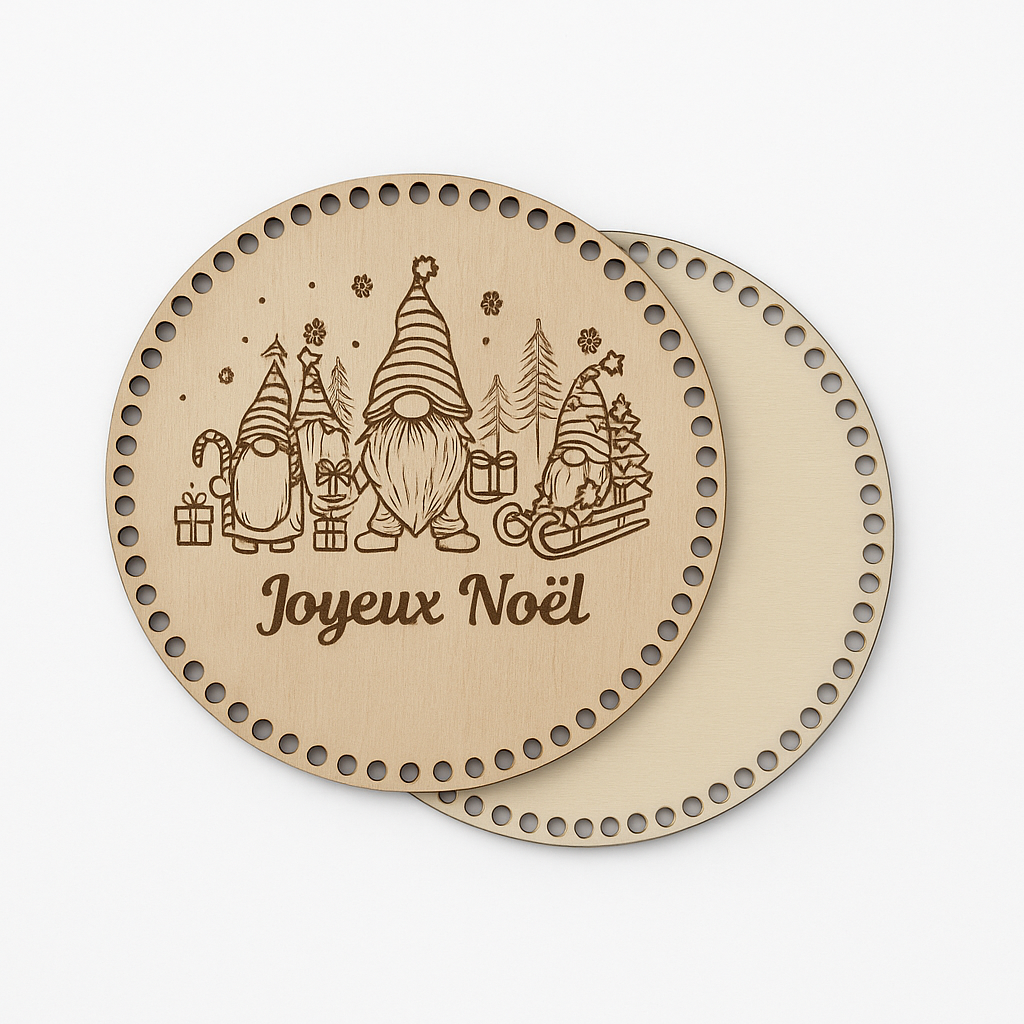 Le dessus est finement gravé au laser avec le motif “Joyeux Noël” et ses détails enchanteurs (sapin, Père Noël, rennes, flocons, cadeaux…), tandis que le dessous reste uni pour un rendu naturel et élégant.