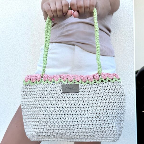💡 Astuce : la bordure fleurie donne un effet granny moderne et frais. Le Tricoton est idéal pour ce type de sac grâce à son rendu souple et naturel.